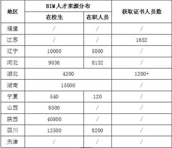 1、來源分布。11個省市提供的數(shù)據(jù)表明,BIM人才主要來源于在校學生,以及接受BIM相關培訓的企業(yè)在崗人員,詳見表所示。